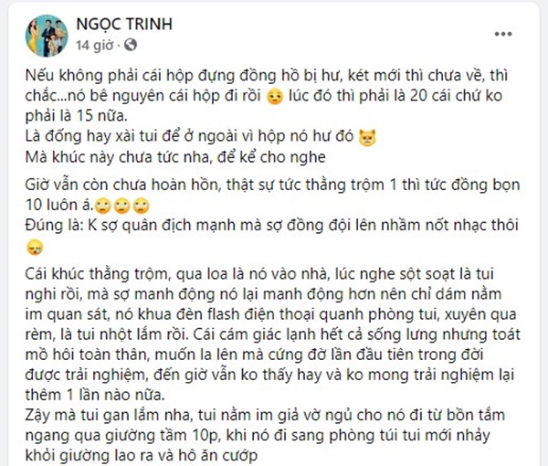 Trước đó, khi phát hiện nhà có người lạ đột nhập, Ngọc Trinh giả vờ ngủ, chờ đến lúc tên trộm đi qua phòng đựng túi mới lao ra khỏi giường và hô hào có cướp. Người đẹp Trà Vinh tường tận kể rằng mình đã chạy thục mạng xuống 2 tầng lầu để kêu 2 giúp việc và trợ lý trong nhà. Nhưng cả ba đều không biết làm gì trong tình huống này nên chỉ biết núp ở một chỗ, gọi điện thoại nhờ bảo vệ cứu giúp. Chính Ngọc Trinh cũng khẳng định: “Đó có lẽ là 1 câu chuyện ăn cướp buồn cười nhất quận 9″;.