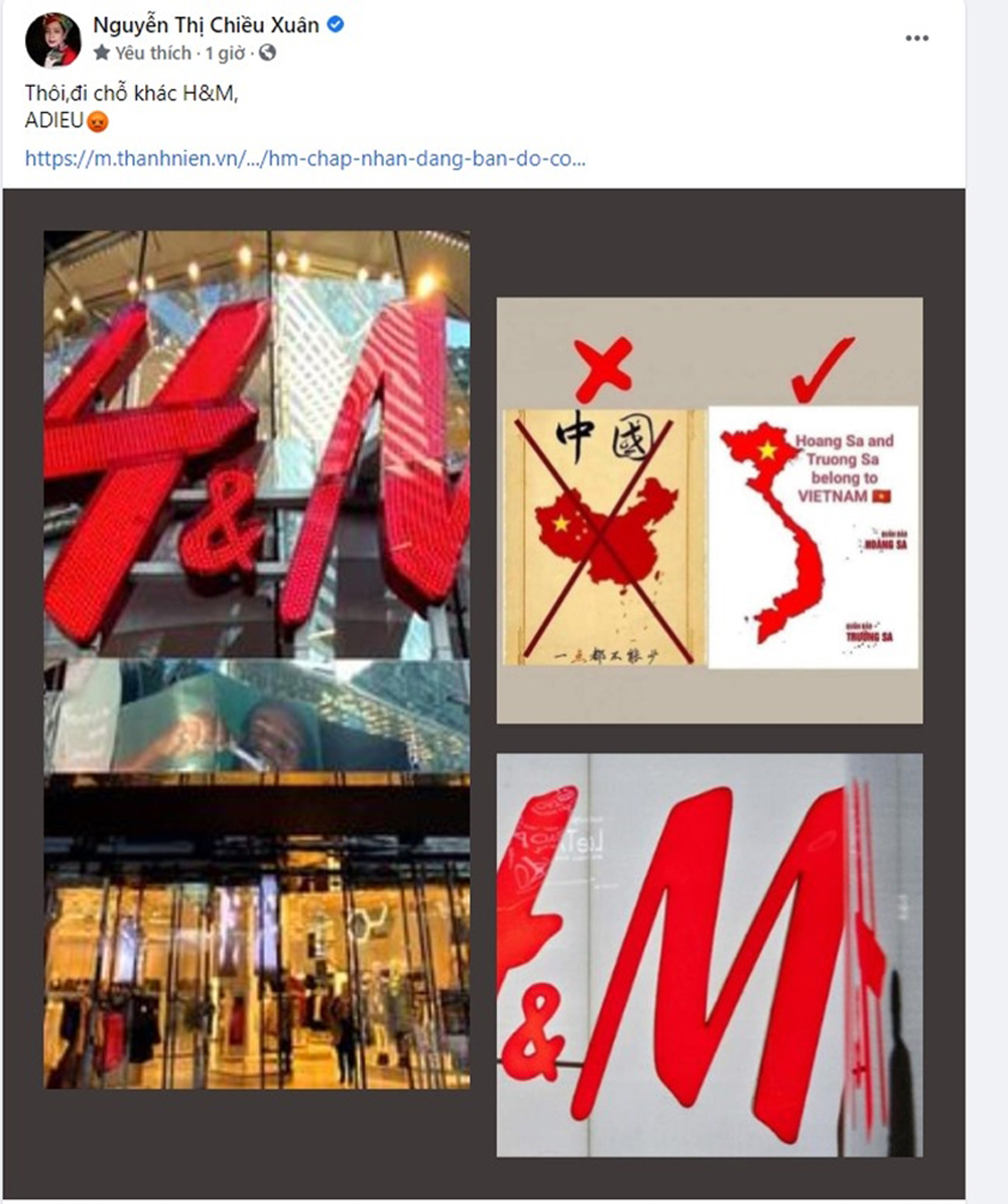 Dân mạng chia sẻ trang Facebook chính thức của H&M để cộng đồng tẩy chay. (Hình: Facebook diễn viên Chiều Xuân)