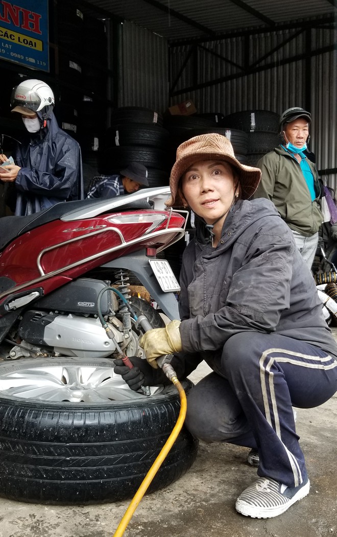 Nhiều tài xế gọi bà Nguyễn Thị Nguyệt Minh (47 tuổi, chủ cửa hàng vá vỏ xe ô tô Kim Thanh) một cách thân thương là nữ “kiện tướng” vá vỏ xe. Nói “kiện tướng” vì dường như ở phố núi sương mù Đà Lạt chỉ có mình bà là phụ nữ làm nghề vá vỏ, thay lốp xe ô tô, nhưng lại được đánh giá tay nghề “cứng” và điệu nghệ hơn cánh mày râu.