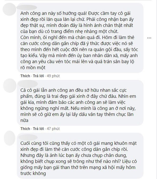 Bạn Chu Bình bày tỏ: “Cuối cùng tôi cũng thấy có một cô gái mang khuôn mặt xinh đẹp đi làm thẻ căn cước công dân gắn chip rồi. Nhưng đây là ảnh lúc bạn ấy chưa chụp chân dung, không biết chụp xong sẽ trông như thế nào nhỉ? Liệu có giống mấy bạn gái than thở trên mạng xã hội mấy hôm trước không?”.