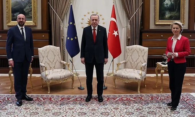 Bà von der Leyen, người phụ nữ duy nhất trong chuyến thăm của hai quan chức châu Âu đến Ankara, đã tỏ ra ngỡ ngàng khi Tổng thống Thổ Nhĩ Kỳ Recep Tayyip Erdogan và ông Michel ngồi vào hai chiếc ghế ở vị trí trung tâm, còn bà phải ngồi trên chiếc sofa liền kề.