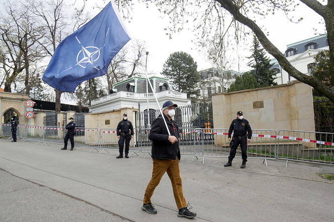 Một người cầm cờ NATO phản đối Nga ngoài đại sứ quán Nga tại Prague, Czech, hôm 18/4. Ảnh: Reuters