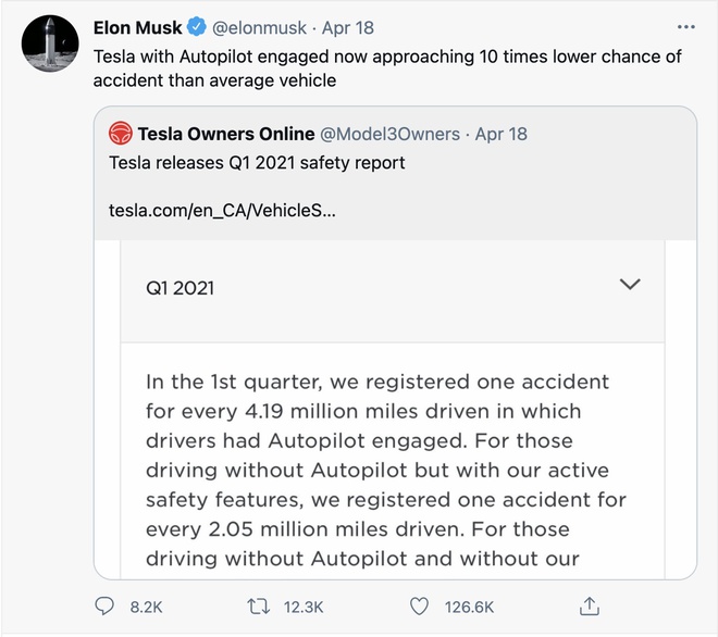 CEO Elon Musk vừa đăng tải trên mạng xã hội Twitter rằng chế độ tự hành Autopilot của công ty giúp giảm tỷ lệ tai nạn xuống thấp hơn 10 lần so với ôtô thông thường.