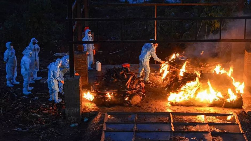 Các thi thể được hỏa thiêu theo quy định phòng chống Covid-19 ở Ấn Độ. Ảnh: Sentinel.