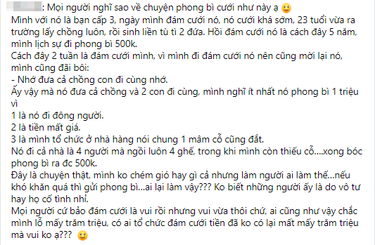 Giống như câu chuyện của cô nàng sau đây khi than phiền về người bạn cấp 3 của mình. Vừa bực mình vì bạn chỉ đi đám cưới 500k – đúng với số tền cách đi vài năm cô bỏ phong bì cho bạn mà cô còn không vui vì bạn dẫn cả chồng con đi theo, ngồi hết 4 ghế trong bàn tiệc. Câu chuyện sau khi đăng tải đã nhận được rất nhiều sự chú ý từ dư luận: