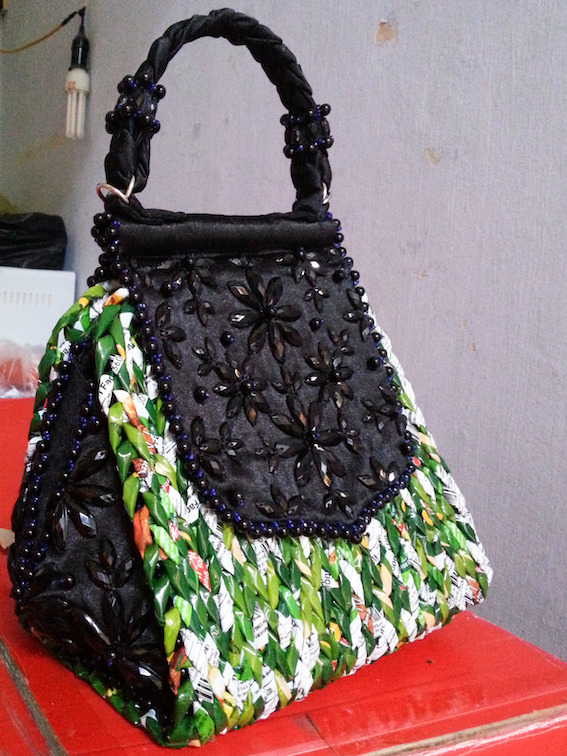Anh thường làm túi với 100% vỏ mỳ gói, về sau anh trang trí thêm hạt cườm để tăng tính thẩm mỹ. Trong hình, chiếc túi được làm từ khoảng hơn 200 chiếc vỏ mỳ, công làm hơn một ngày.