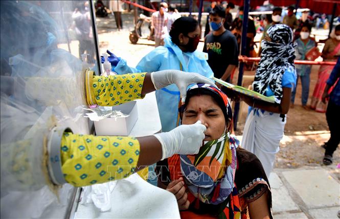 Nhân viên y tế lấy mẫu xét nghiệm COVID-19 cho người dân tại Hyderabad, Ấn Độ, ngày 3/5/2021. Ảnh: THX/TTXVN