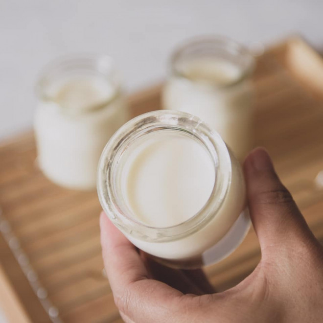 Bước 4. Khử trùng hũ đựng bằng cách nướng hoặc luộc qua nước sôi rồi phơi thật ráo. Nên dùng hũ thủy tinh thay vì hũ nhựa. Rót sữa chua vào hũ.