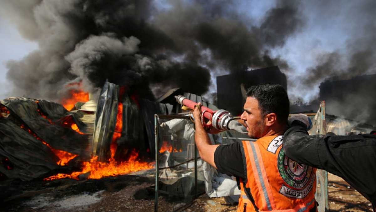 Lính cứu hỏa người Palestine nỗ lực cứu một nhà xưởng trúng đạn của Israel ở phía bắc Dải Gaza ngày 17/5 - Ảnh: REUTERS.