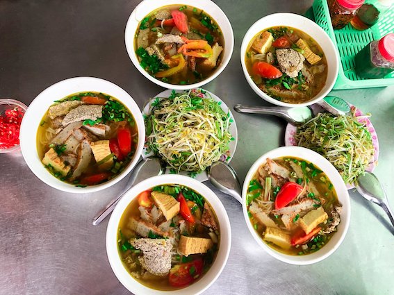 Các quán bánh canh, bún bò, cơm tấm, bún thịt nướng... tại chợ Côn Đảo, hướng bên đường Võ Thị Sáu.