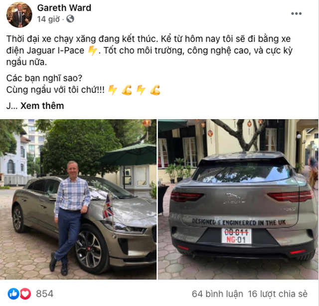 Đại sứ Vương quốc Anh tại Việt Nam ông Gareth Ward mới đây đã đăng lên mạng xã hội bức ảnh chụp cùng mẫu ô tô điện Jaguar I-Pace. Trên Facebook, ông viết: "Thời đại xe chạy xăng đang kết thúc. Kể từ hôm nay tôi sẽ đi bằng xe điện Jaguar I-Pace. Tốt cho môi trường, công nghệ cao, và cực kỳ ngầu nữa".