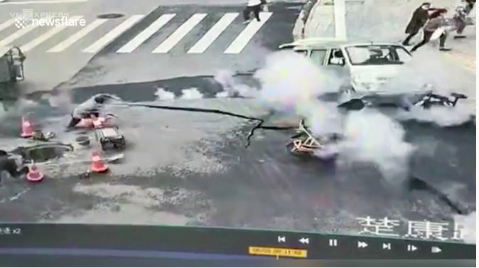 Old  Default Lòng đường Vũ Hán bất ngờ phát nổ hất tung người, ôtô, xe máy
