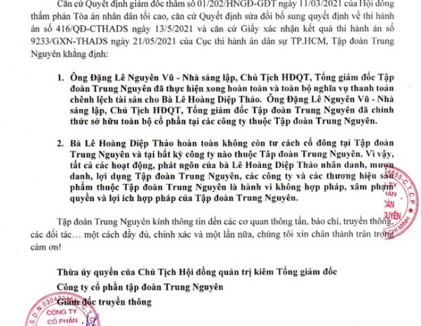 “Tất cả các hoạt động, phát ngôn của bà Lê Hoàng Diệp Thảo nhân danh, mượn danh, lợi dụng Tập đoàn Trung Nguyên, các công ty, và các thương hiệu sản phẩm thuộc Tập đoàn Trung Nguyên là hành vi không hợp pháp, xâm phạm quyền và lợi ích hợp pháp của Tập đoàn Trung Nguyên”, thông báo của Tập đoàn Trung Nguyên nêu rõ.