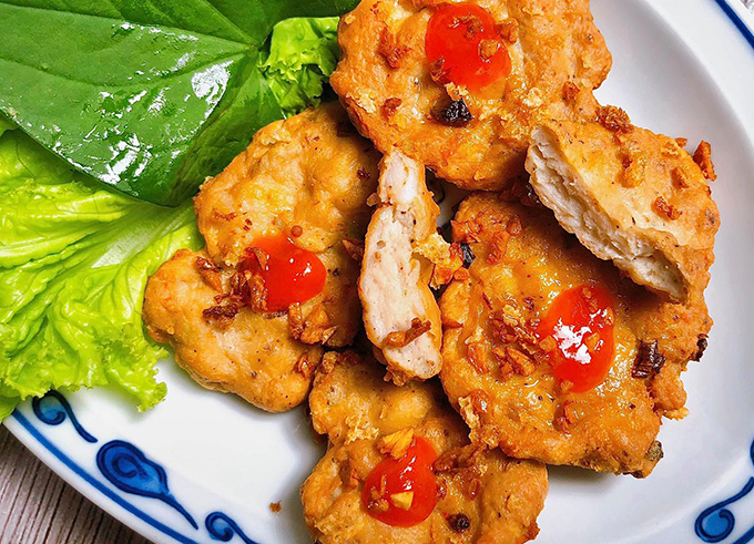 Sau đó, lấy phần chả ra, thấm ướt tay với nước. Vò chả thành từng viên tròn rồi nhấn dẹp thành miếng vừa ăn. Đun sôi dầu, thả chả vào chiên với lửa vừa, chả chín vàng 2 mặt thì gắp ra cho ráo dầu. Xếp chả ra đĩa ăn kèm rau và tương ớt.