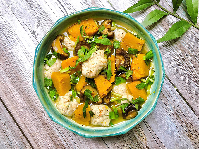 Món canh thơm ngon với bí đỏ mềm béo cùng viên mọc tôm dai ngọt đậm đà. Món này ăn cùng cơm vào những ngày hè, mưa gió.