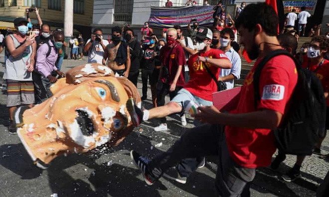 Người biểu tình đá vào tượng tổng thống Brazil, Jair Bolsonaro, trong cuộc biểu tình ở Rio de Janeiro vào ngày 29/5. Ảnh: Reuters.