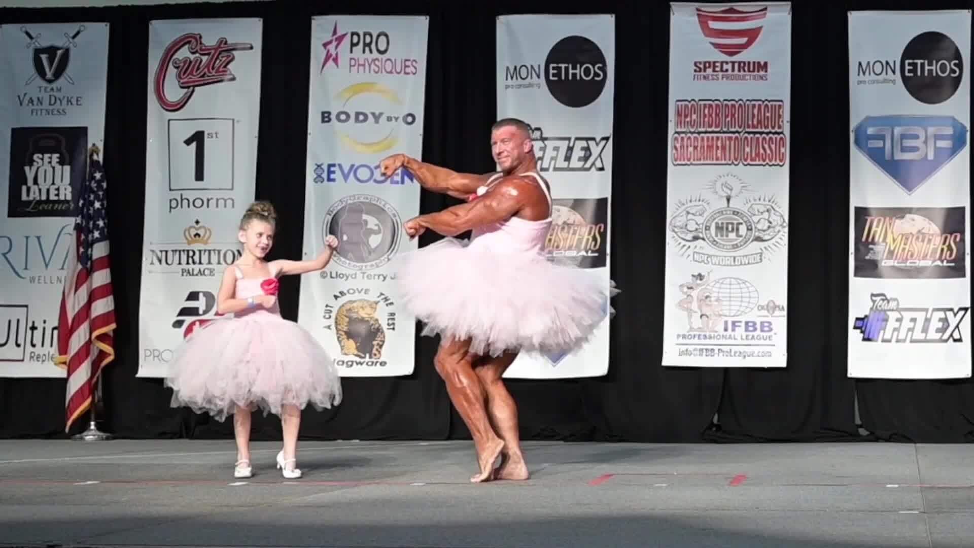 Ông bố lực lưỡng mặc váy múa với con gái. Josh Wade và con gái Sydney mặc váy múa bale tại Giải vô địch IFBB Pro League. Đây đúng là ông bố yêu chiều con gái nhất quả đất.