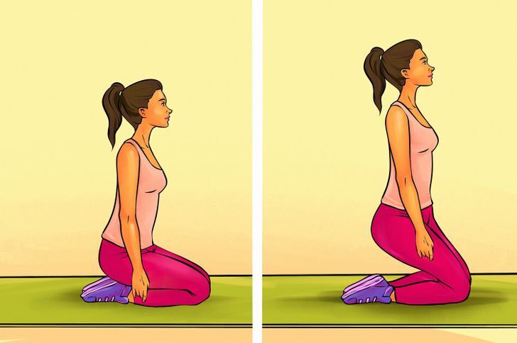 Ngồi quỳ trên thảm, mũi chân úp xuống, hai tay duỗi thẳng song song với thân. Siết chặt cơ mông, nâng người lên cao 30 độ, giữ thẳng lưng và tay. Giữ trong vài giây rồi trở lại vị trí ban đầu. Lặp lại động tác 10 lần. Thực hiện 3 - 5 hiệp.
