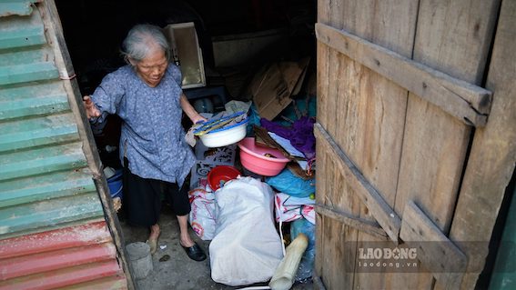 Trong căn nhà trọ chưa đầy 10m2 ngập ngụa toàn chai vỏ, cụ Nguyễn Thị Phải (80 tuổi) lò dò từng bước đi chậm chạp. Nhiều vật linh tinh trong nhà cũng là một trong các yếu tố khiến nơi này hấp nhiệt nhanh chóng khi nắng lên.