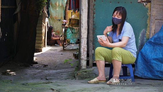 chị Thu ( 35 tuổi) “tranh thủ” bóng mát trước hiên nhà để tránh cái nóng bí bách, khó chịu bên trong căn phòng mái lợp fibro xi măng hút nhiệt xập xệ mà mình đang thuê.