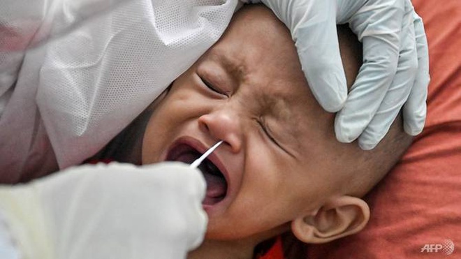 Một đứa trẻ đang xét nghiệm Covid-19 ở Shah Alam, ngoại ô thủ đô Kuala Lumpur. Ảnh: AFP.