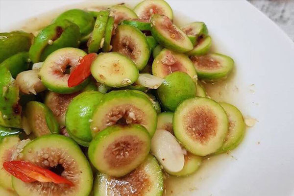 Sung sau khi rửa sạch với nước, thái lát mỏng và thả ngay vào bát nước giấm muối đã pha để sung không bị thâm đen và giảm độ chát của sung.
