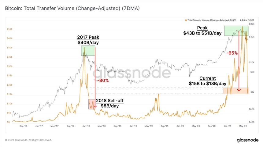 Phân tích của Glassnode về số liệu Bitcoin trong tuần qua cũng cho thấy một số tín hiệu tiêu cực. Tổng giá trị Bitcoin giao dịch trong 2 tuần qua đã giảm tới 65%, từ 43 tỷ USD xuống chỉ còn 15 tỷ USD/ngày. Theo công ty số liệu này, đây là mức giảm mạnh nhất kể từ khi Bitcoin mất giá đột ngột vào đầu năm 2018. Khi đó, giá trị giao dịch đã giảm 80% sau 3 tháng.