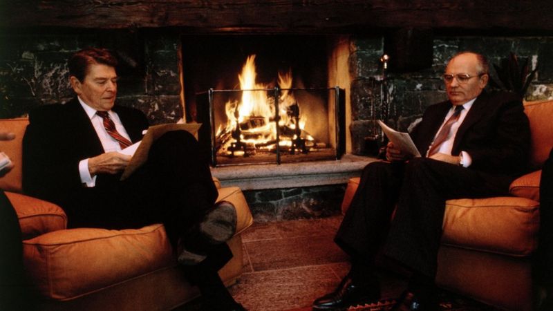 Tổng thống Mỹ Ronald Reagan (trái) và nhà lãnh đạo Liên Xô Mikhail Gorbachev tại cuộc hội đàm lịch sử "bên lửa" tại Geneva tháng 11 năm 1985
