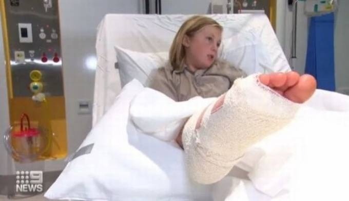 Jackson hiện phục hồi trong bệnh viện sau khi bị cá mập cắn chân. Ảnh: Nine News.