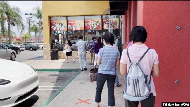 Khách xếp hàng đợi mua đồ ăn tại Little Saigon sau lệnh mở cửa toàn phần.