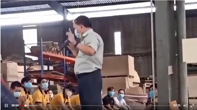 Trước đó, mạng xã hội chia sẻ video được cho là của công nhân quay và đăng tải ghi lại cảnh một người đàn ông đang thuyết phục công nhân ở lại công ty để phòng, chống lây lan dịch Covid-19. Người này hứa với công nhân, công ty sẽ lo mỗi ngày 3 bữa miễn phí, người nào tăng ca sẽ có thêm phần ăn khuya. Ngoài ra, công nhân ở lại công ty sẽ được phụ cấp thêm mỗi tháng 1 triệu đồng.