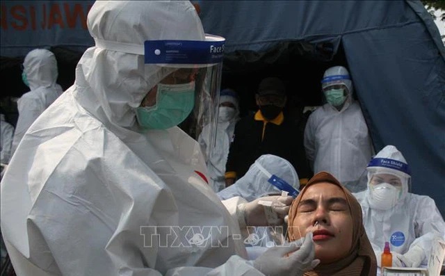 Nhân viên y tế lấy mẫu xét nghiệm COVID-19 cho người dân tại Surabaya, Đông Java, Indonesia, ngày 7/6/2021. Ảnh minh họa