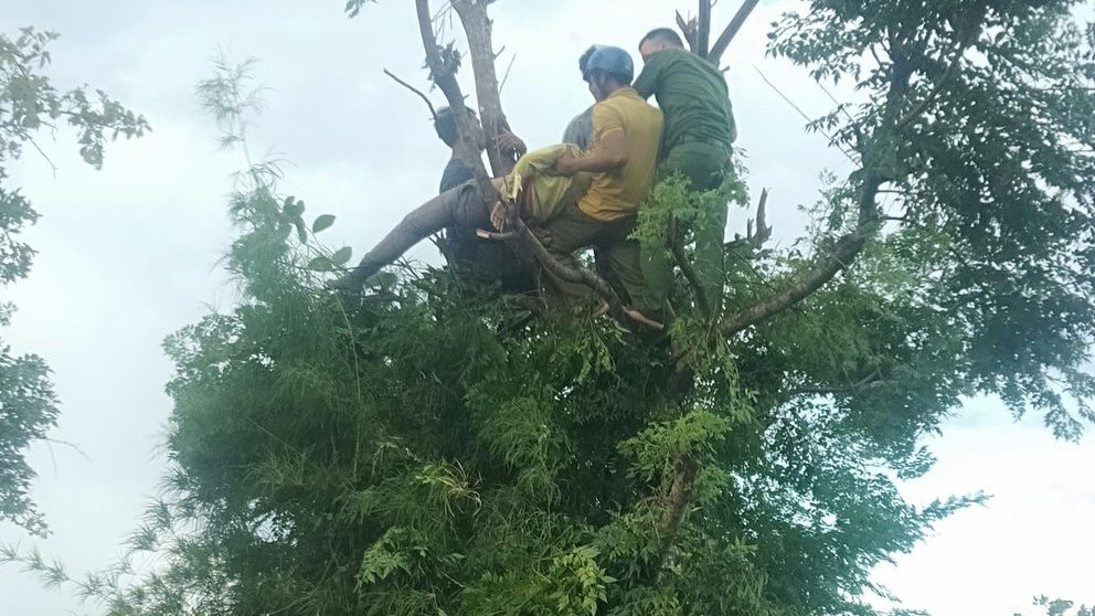Thời điểm này, chị M. trèo lên cây cao để chặt lá thì vô tình vướng vào đường dây điện khiến bị điện giật nằm ngất lịm trên cành cây.