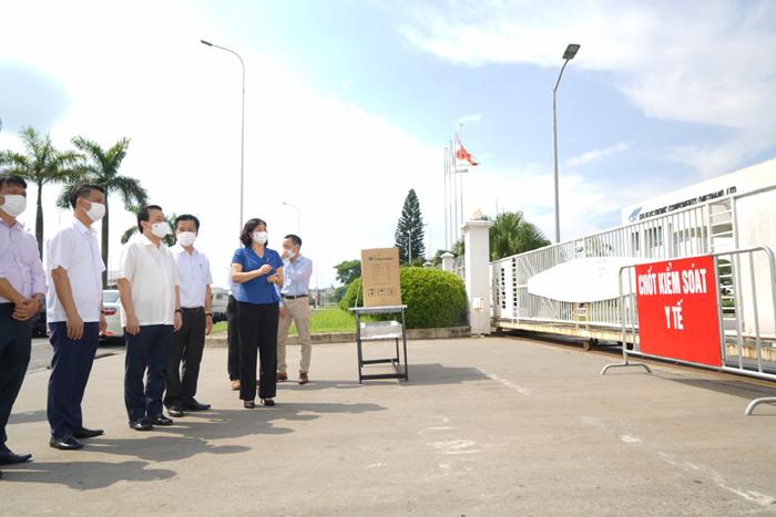 Phó Bí thư Thường trực Thành ủy Nguyễn Thị Tuyến kiểm tra tại khu vực Công ty TNHH linh kiện điện tử SEI Việt Nam - Khu công nghiệp Thăng Long - Ảnh: Trọng Toàn