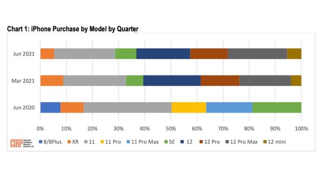 Báo cáo mới nhất từ Consumer Intelligence Research Partners (CIRP) chỉ ra rằng thế hệ iPhone 12 chiếm tới 63% doanh số iPhone bán ra tại thị trường Mỹ trong quý II/2021.