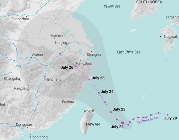 Dự báo khí tượng ở Trung Quốc cho hay, bão In-fa có thể mang lượng mưa lên đến 300mm khi đổ bộ vào Thượng Hải và đồng bằng Trường Giang, và có thể mạnh lên thành siêu bão.