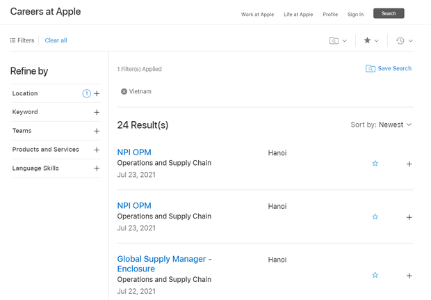Tổng cộng có 24 vị trí được Apple đăng tải tuyển dụng.