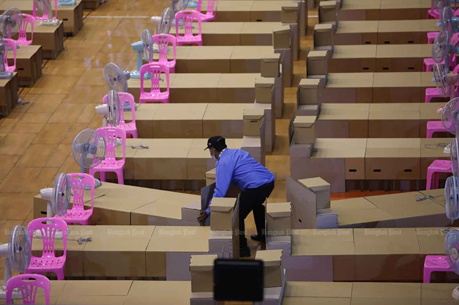 Một sân vận động ở quận Min Buri của Bangkok được chuyển thành trung tâm cách ly tập trung cho bệnh nhân COVID-19 với 200 giường. Ảnh: Bangkok Post
