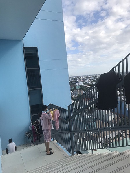 Những ngày ở bệnh viện dã chiến, Liên duy trì thói quen dọn dẹp phòng ốc, lau chùi nhà vệ sinh chung sạch sẽ. Cô và những bệnh nhân trong phòng không muốn những tình nguyện viên làm hậu cần vất vả thêm. Ảnh: Nhân vật cung cấp.