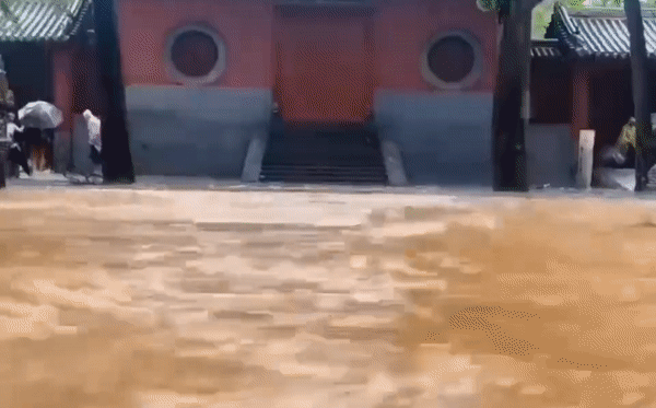 Nước lũ chảy xiết ngay trước cổng chùa Thiếu Lâm Tự, Trung Quốc