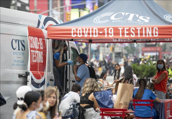 Một điểm xét nghiệm COVID-19 tại Quảng trường Thời đại ở New York, Mỹ, ngày 20/7/2021. Ảnh: THX/TTXVN