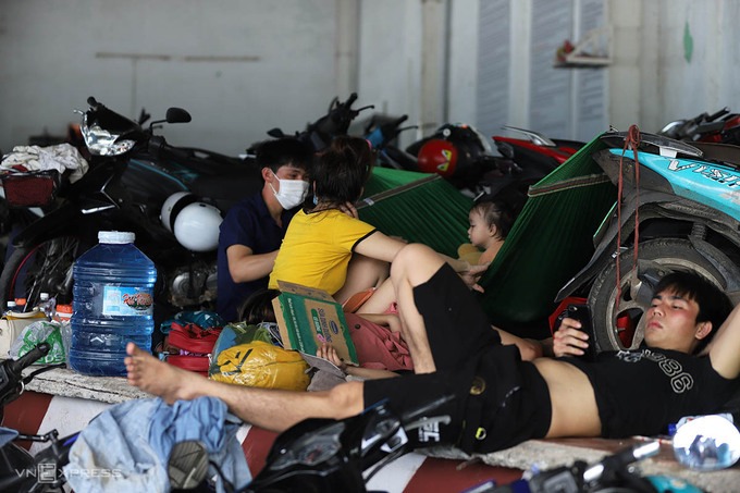 Tại khu vực trạm trung chuyển trên đèo Hải Vân, nhiều người lớn và trẻ em mệt mỏi sau hành trình hơn 1.000 km nên nằm ngủ thiếp trên sàn nhà. Anh Trương Đức Tri, 31 tuổi ở TP Huế, cho biết vào TP HCM làm nghề đóng giày, hai tháng nay thất nghiệp. "Áp lực tiền nhà trọ và chi phí sinh hoạt nên tôi quyết định thu dọn hành lý, đi làm xét nghiệm để lấy giấy chứng nhận chạy xe máy xuyên đêm về quê", anh Tri cho hay