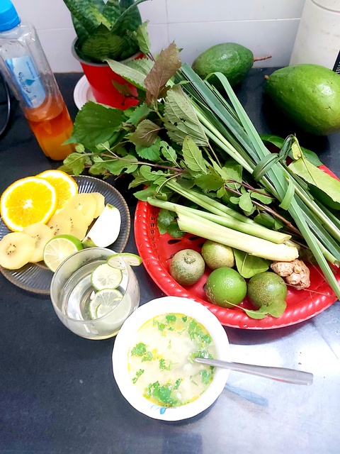 Chị Ly cho biết mình sốt nhẹ, đau họng, ho khan và đau mỏi cơ thể. Chị sử dụng thuốc điều trị triệu chứng, sau đó xông mũi và miệng bằng nước gừng, sả, hương nhu, dầu tràm.