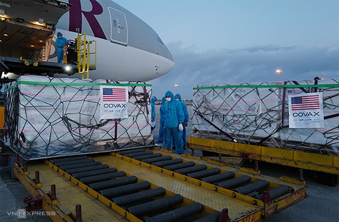 Máy bay chở hơn hai triệu liều vaccnine Moderna do Mỹ hỗ trợ Việt Nam hạ cánh xuống sân bay Nội Bài, Hà Nội ngày 10/7. Ảnh:Ngọc Thành.