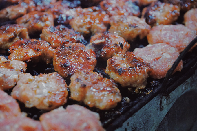 Bánh mì thịt nướng có điểm nhấn là phần thịt heo băm nhuyễn trộn cùng nước sốt đặc biệt, nặn thành các viên tròn dẹp nướng trên lửa than hồng cho chín vàng đều và dậy mùi thơm. Thịt heo tươi được nặn liền tay, nướng tới đâu bán tới đó nên luôn giữ được độ nóng, thêm đồ chua, dưa leo, nước sốt, ớt băm và ít cọng ngò là đã có ổ bánh mì chất lượng cho thực khách lót dạ buổi chiều. Quán nằm trong con hẻm nhỏ trên đường Nguyễn Trãi, quận 1. Ảnh: Di Vỹ