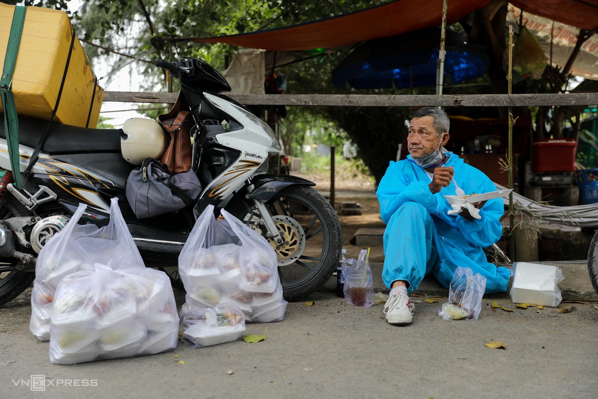 Khoảng 14h30, sau khi hết 100 phần cơm ông lại chạy về bếp ăn trưa, nghỉ ngơi rồi lấy tiếp các suất ăn đi phát. Ông tìm một góc bên vệ đường ngồi ăn để tránh tiếp xúc với mọi người.