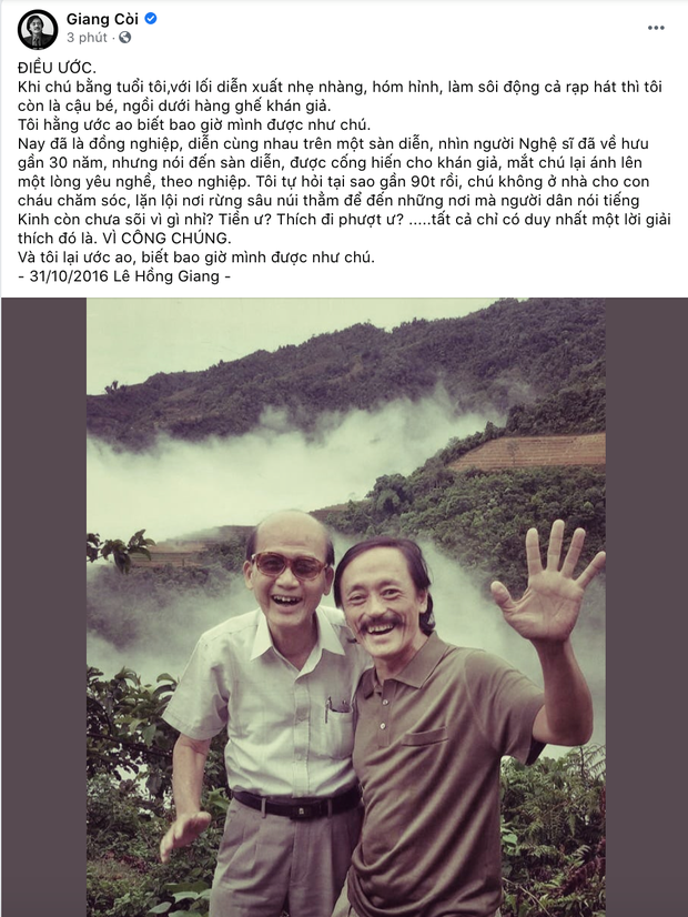 Nay đã là đồng nghiệp, diễn cùng nhau trên một sàn diễn, nhìn người nghệ sĩ đã về hưu gần 30 năm, nhưng nói đến sàn diễn, được cống hiến cho khán giả, mắt chú lại ánh lên một lòng yêu nghề, theo nghiệp. Tôi tự hỏi tại sao gần 90 tuổi rồi, chú không ở nhà cho con cháu chăm sóc, lặn lội nơi rừng sâu núi thẳm để đến những nơi mà người dân nói tiếng Kinh còn chưa sõi vì gì nhỉ? Tiền ư? Thích đi phượt ư? Tất cả chỉ có duy nhất một lời giải thích đó là VÌ CÔNG CHÚNG. Và tôi lại ước ao, biết bao giờ mình được như chú".