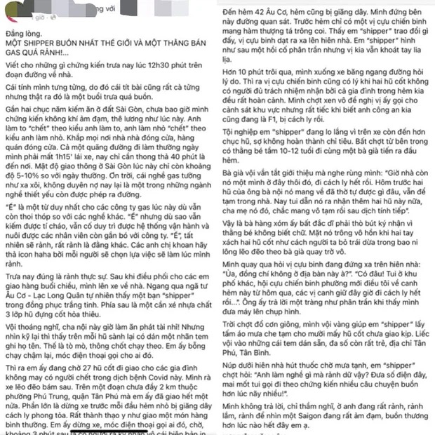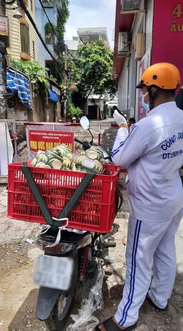 Trên một đoạn chưa đầy 2km thuộc phường Phú Trung, quận Tân Phú mà em ấy đã giao hết một nửa. Phần lớn là dừng xe trước mỗi đầu hẻm nhỏ bị giăng dây cách ly phong tỏa. Rất thành thạo y như giao một món hàng bình thường. Em ấy dừng xe, móc điện thoại gọi ai đó, chờ, khoảng 3 phút sau là có người ra ký nhận vô cái biên bản in sẵn. Mình vẫn lẽo đẽo theo sau. Đến hẻm 42 Âu Cơ, hẻm cũng bị giăng dây. Mình đứng bên này đường quan sát...".