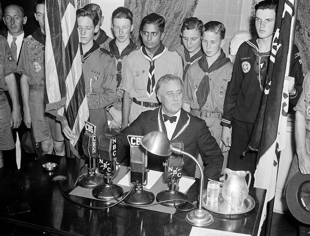 Các hướng đạo sinh đứng quanh tổng thống Franklin D. Roosevelt khi ông gửi lời chào đến toàn thể các hướng đạo sinh nước Mỹ từ Nhà Trắng ngày 21/8/1935.