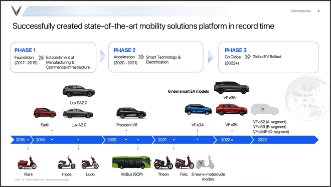Trong báo cáo quý II/2021 của VinFast, hãng xe Việt đã chia sẻ về lộ trình phát triển của mình, bao gồm cả kế hoạch ở vòng tiếp theo (phase 3). Theo đó VinFast đang bước vào hoàn tất giai đoạn hai, đó là phát triển công nghệ thông minh và điện khí hóa.